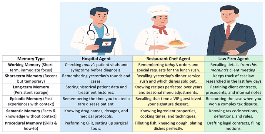 - Procedural Memory: Workflows and skills (“Step-by-step process for invoice approval: validate → route → notify”).