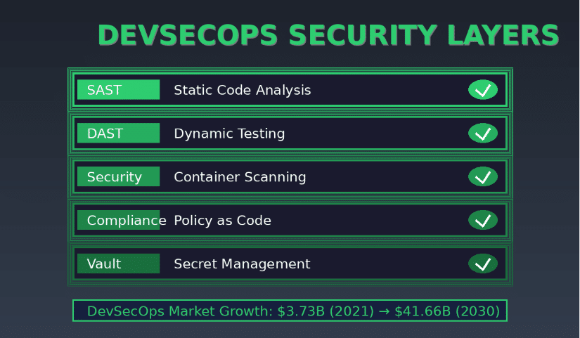 The DevSecOps market is experiencing rapid growth, forecast to expand from $3.73 billion to $41.66 billion over the next decade. AI autocoding embeds security from the start with automated SAST/DAST configurations, container scanning, policy as code, and secret management integrations for HashiCorp Vault, AWS Secrets Manager, and Azure Key Vault.