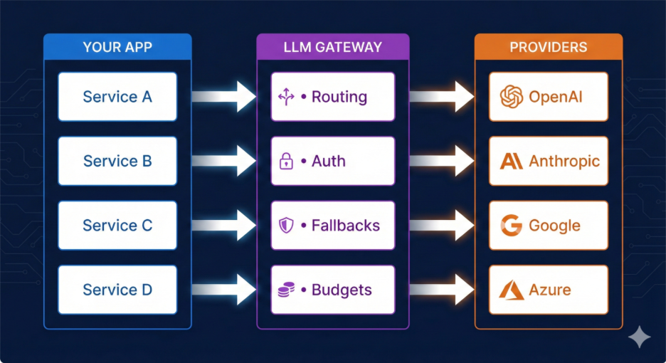 This isn’t a new pattern. API gateways have existed for decades. But LLMs introduce unique challenges—variable costs per token, different response formats across providers, rate limits that vary by model, and the need for intelligent fallbacks when a provider goes down.