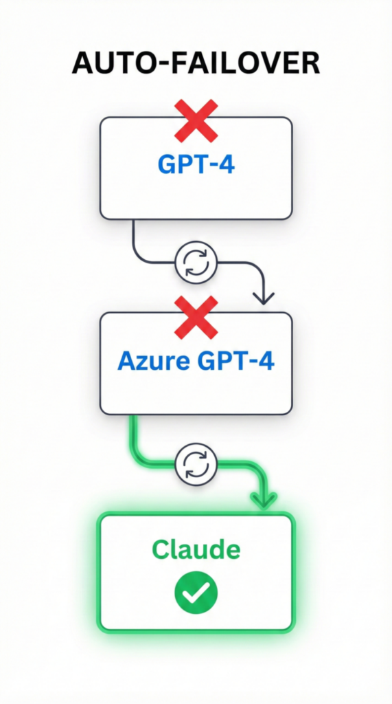The gateway handles retries automatically. If OpenAI returns a rate limit error, it waits and retries. If that fails, it routes to Azure. If Azure is down, it falls back to Claude. Your application sees a successful response—it never knows there was a problem.
