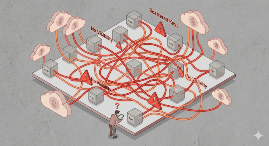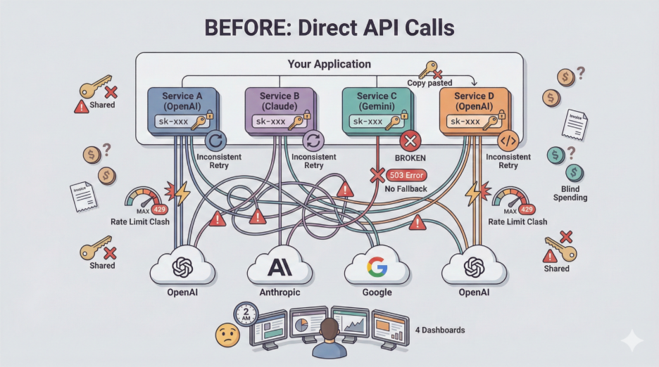 Direct API calls work—until they don’t. The problems emerge gradually: scattered keys, surprise costs, production failures at 2 AM, and debugging across five dashboards.