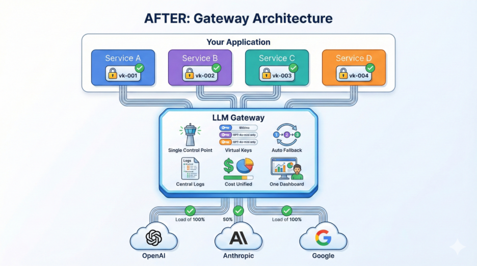 Think of it as Nginx for LLMs. Your services don’t talk directly to OpenAI or Claude or Gemini. They talk to the gateway. The gateway handles everything else.
